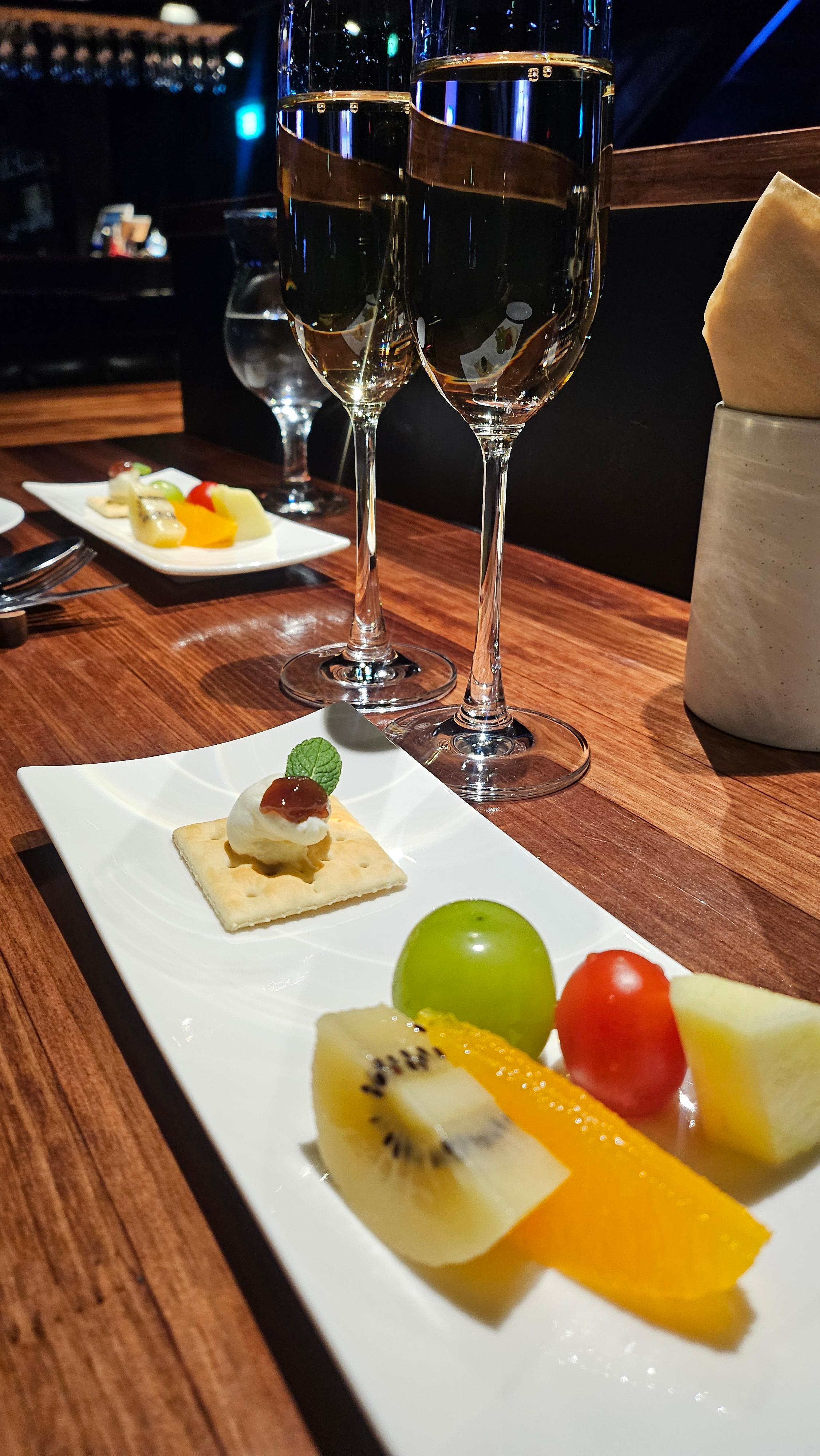 이날 커버차지에 포함된 웰컴푸드는 신선한 과일과 까망베르 치즈, 라즈베리가 올라간 크래커 카나페였어요. 웰컴 드링크로 나온 스파클링 와인은 과하게 달지 않고 입맛을 살짝 깨워주는 느낌이라 시작으로 좋았어요.