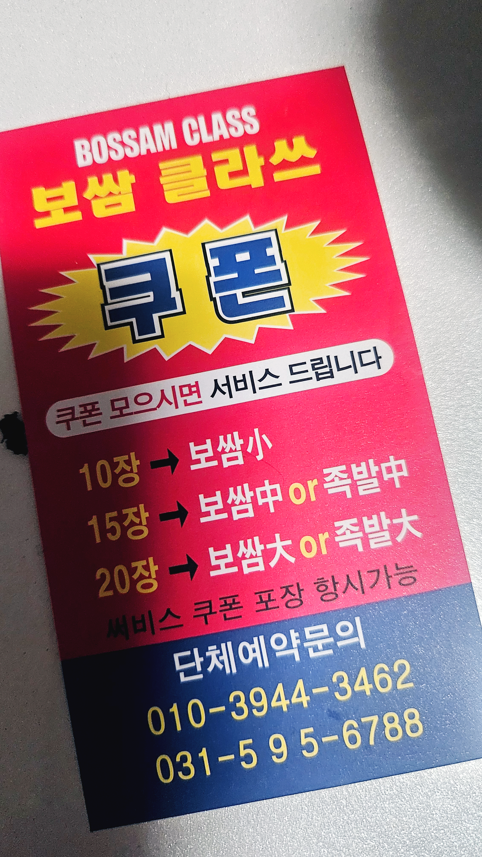 쿠폰을 10장 모으면 보쌈 소(小) 사이즈를 서비스로 제공받을 수 있어, 단골 고객들에게는 이보다 더 좋은 혜택이 없다.